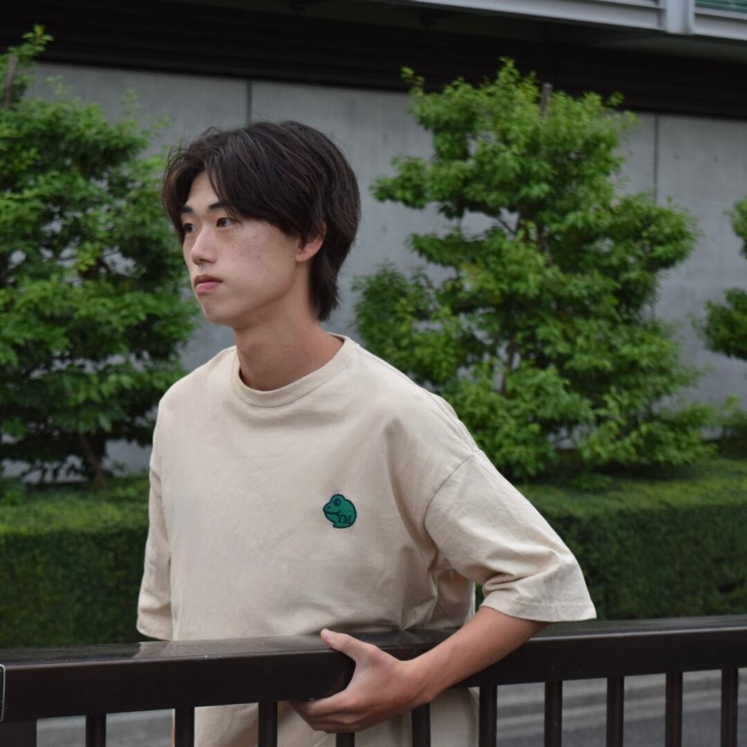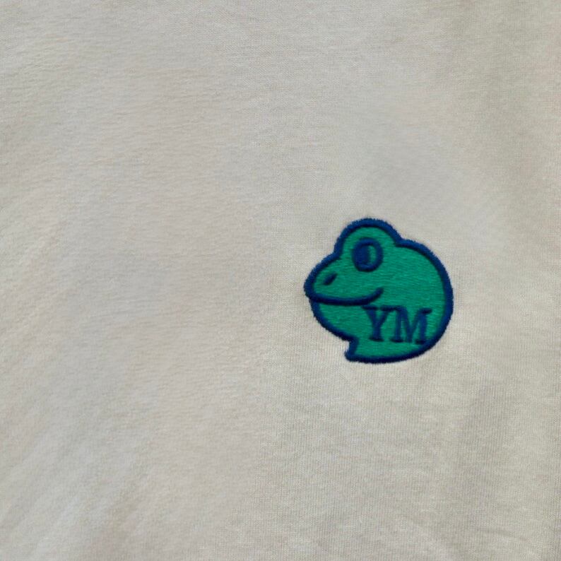 胸のワンポイントの刺繍にはyongmingのYMがカエルに書いてあり、バックのプリントには大きなゲームに可愛いカエルが座ってプレイしている様子が描かれてます